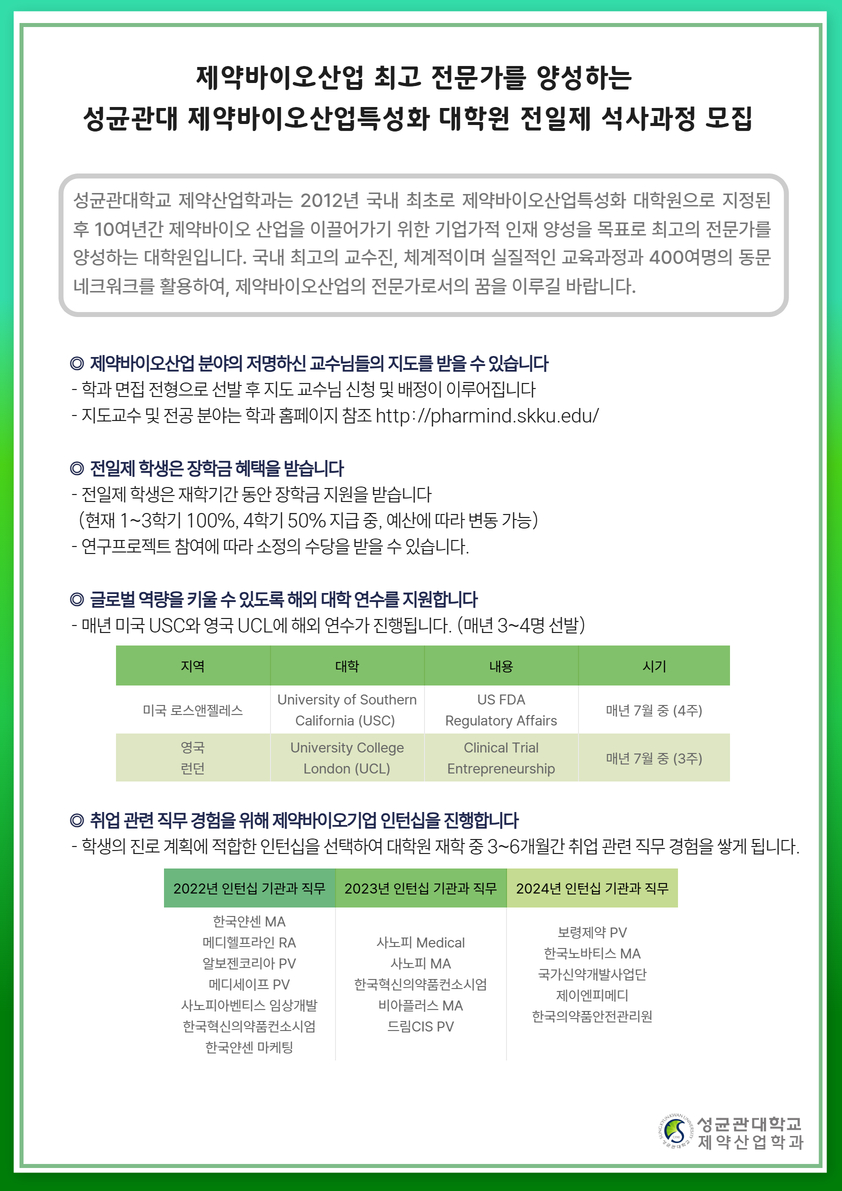 2026학년도 전기 성균관대 제약바이오산업특성화 대학원 전일제 석사과정 모집(9/24~10/15)